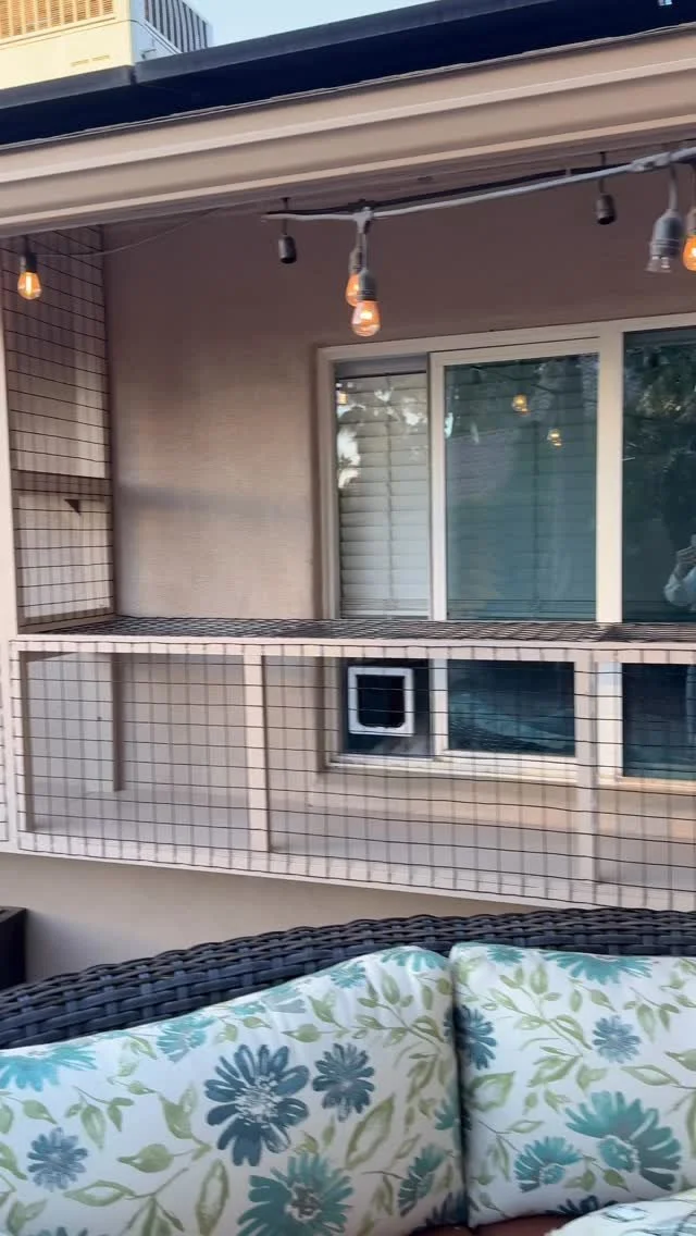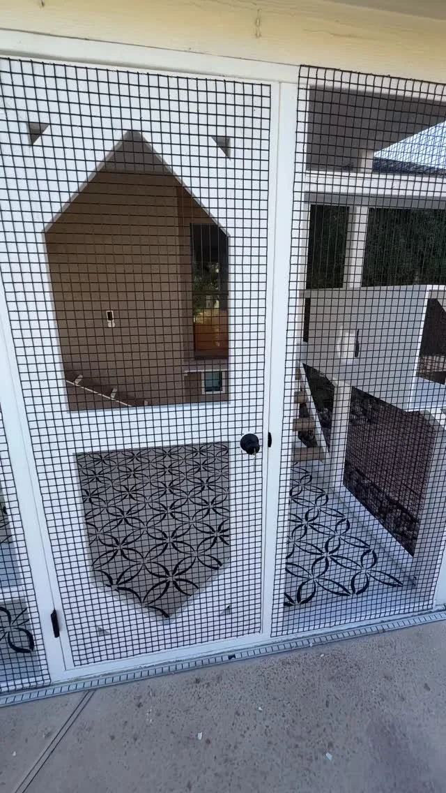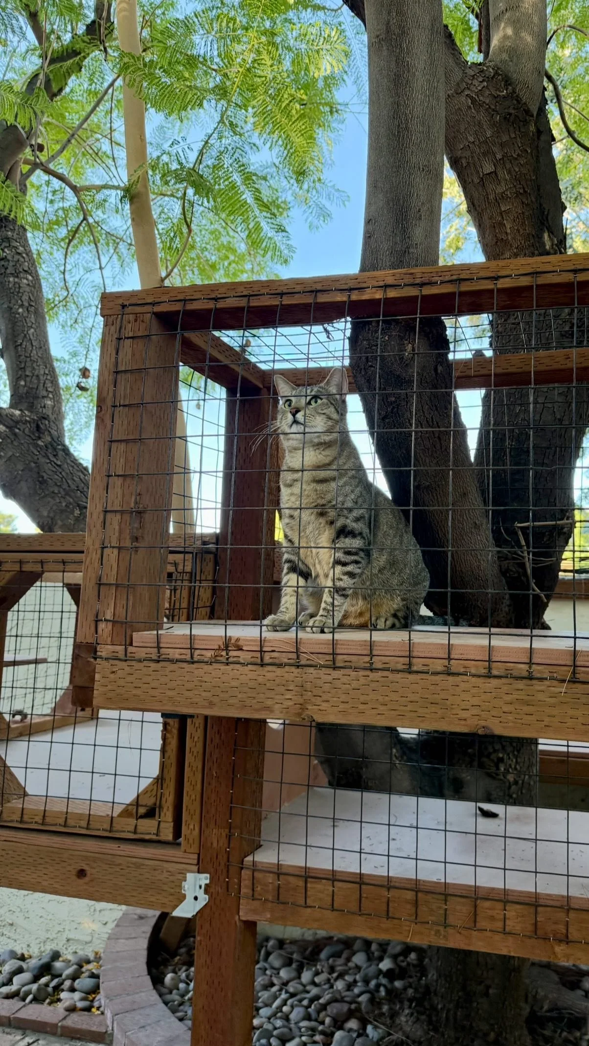 This cozy yet functional catio offers a safe and enriching outdoor space for both resident and foster cats. Though compact in size, it features thoughtfully placed shelving, a sturdy cat pole, and step platforms to encourage climbing, lounging, and play. This custom design gives the cats fresh air and stimulation while remaining fully protected. A purrfect spot for feline residents to enjoy life beyond the indoors.